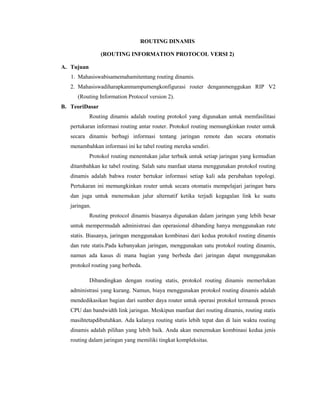 Dokumen ini membahas tentang protokol routing dinamis, khususnya RIP versi 2, yang memungkinkan router untuk berbagi informasi routing secara otomatis dalam jaringan. RIP v2 menawarkan beberapa perbaikan dibandingkan versi sebelumnya, termasuk dukungan untuk subnet mask dan otentikasi untuk keamanan. Perbedaan utama antara RIP versi 1 dan versi 2 adalah bahwa versi 2 bersifat classless dan mendukung VLSM, sedangkan versi 1 bersifat classful dan tidak mendukung fitur tersebut.