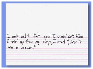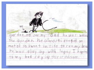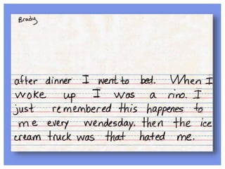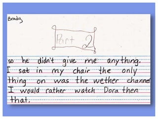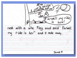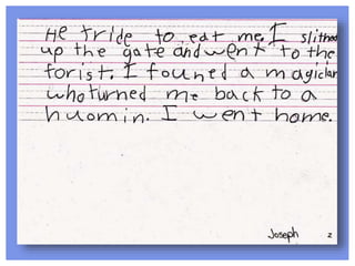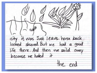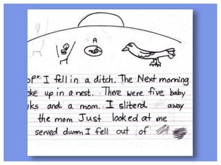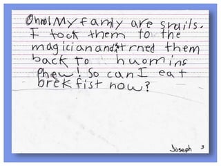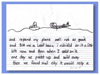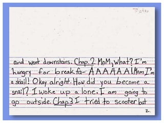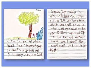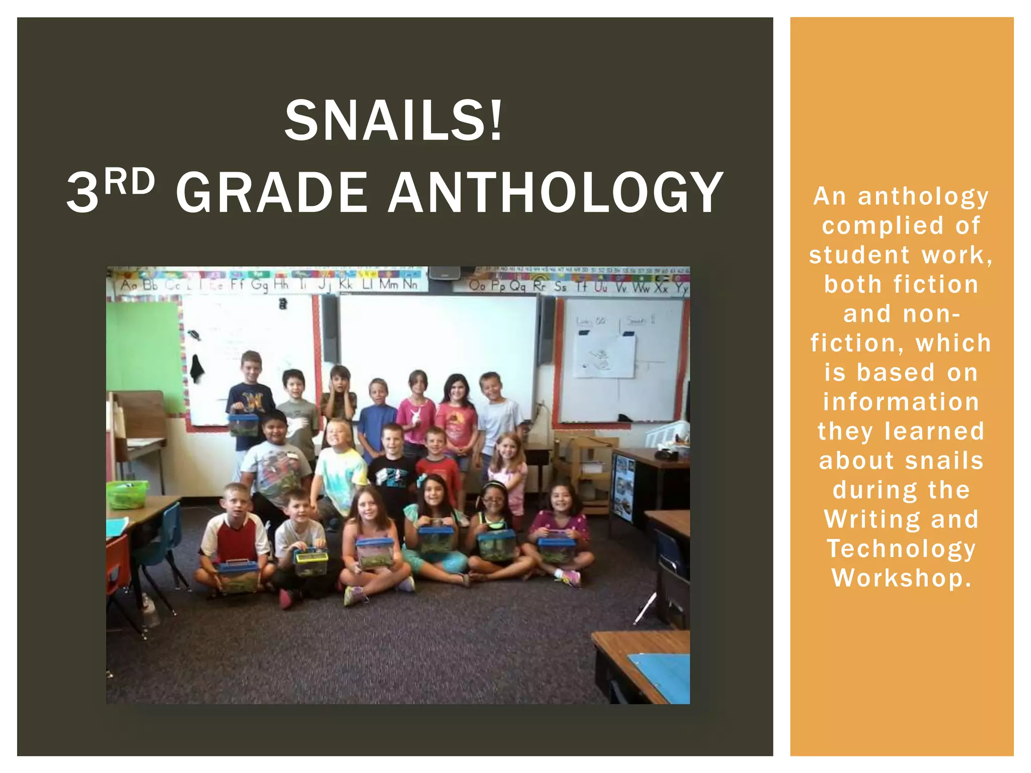 This anthology contains short stories and factual writings by 3rd grade students about snails. It includes pieces on snail communication, habitats, predators, shells, and more. Each student's work is introduced with their name and piece title. Many students also wrote a short fictional story about waking up as a snail. The anthology was compiled as part of a writing and technology workshop where students learned about snails.