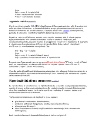 La riproducibilità è la concordanza delle misure di una grandezza variando le condizioni di misurazione, e si distingue dalla ripetibilità, che si riferisce a misurazioni effettuate in condizioni identiche. Errori di riproducibilità indicano discrepanze nelle misure e sono essenziali per valutare l'incertezza di misura, spesso analizzati attraverso un approccio statistico. La riproducibilità di uno strumento viene valutata variando le condizioni di contorno, come posizione e ambiente, per identificare potenziali errori sistematici.