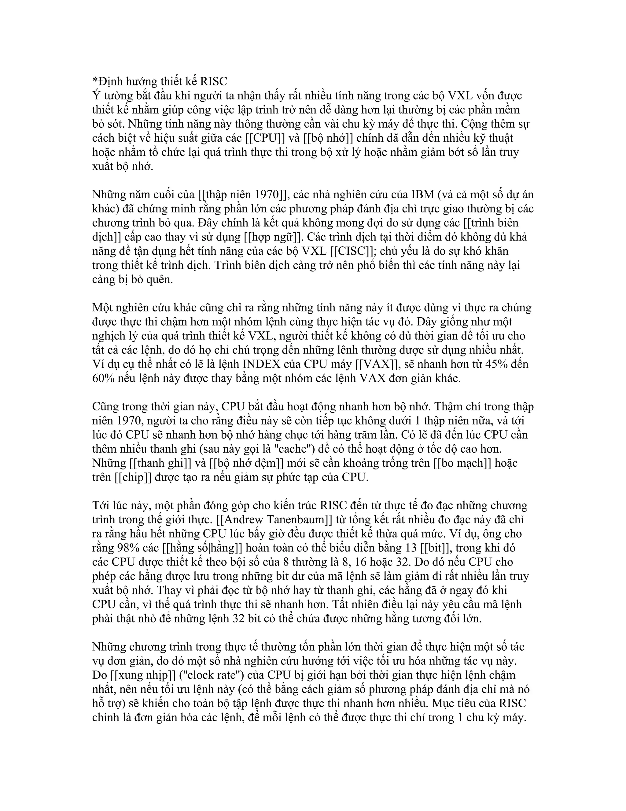 Tài liệu mô tả sự phát triển và nguyên lý thiết kế của kiến trúc vi xử lý RISC, nhấn mạnh sự cần thiết phải tối ưu hóa lệnh để đạt hiệu suất cao hơn so với các kiến trúc CISC. Việc đơn giản hóa lệnh và tối ưu hóa truy xuất bộ nhớ được coi là chìa khóa để cải tiến hiệu suất xử lý, đặc biệt trong bối cảnh công nghệ vi xử lý đang tiến bộ nhanh chóng. Cuối cùng, nó cũng chỉ ra những điểm yếu ban đầu của RISC và sự ra đời của các công nghệ mới nhằm nâng cao khả năng xử lý song song và hiệu suất.