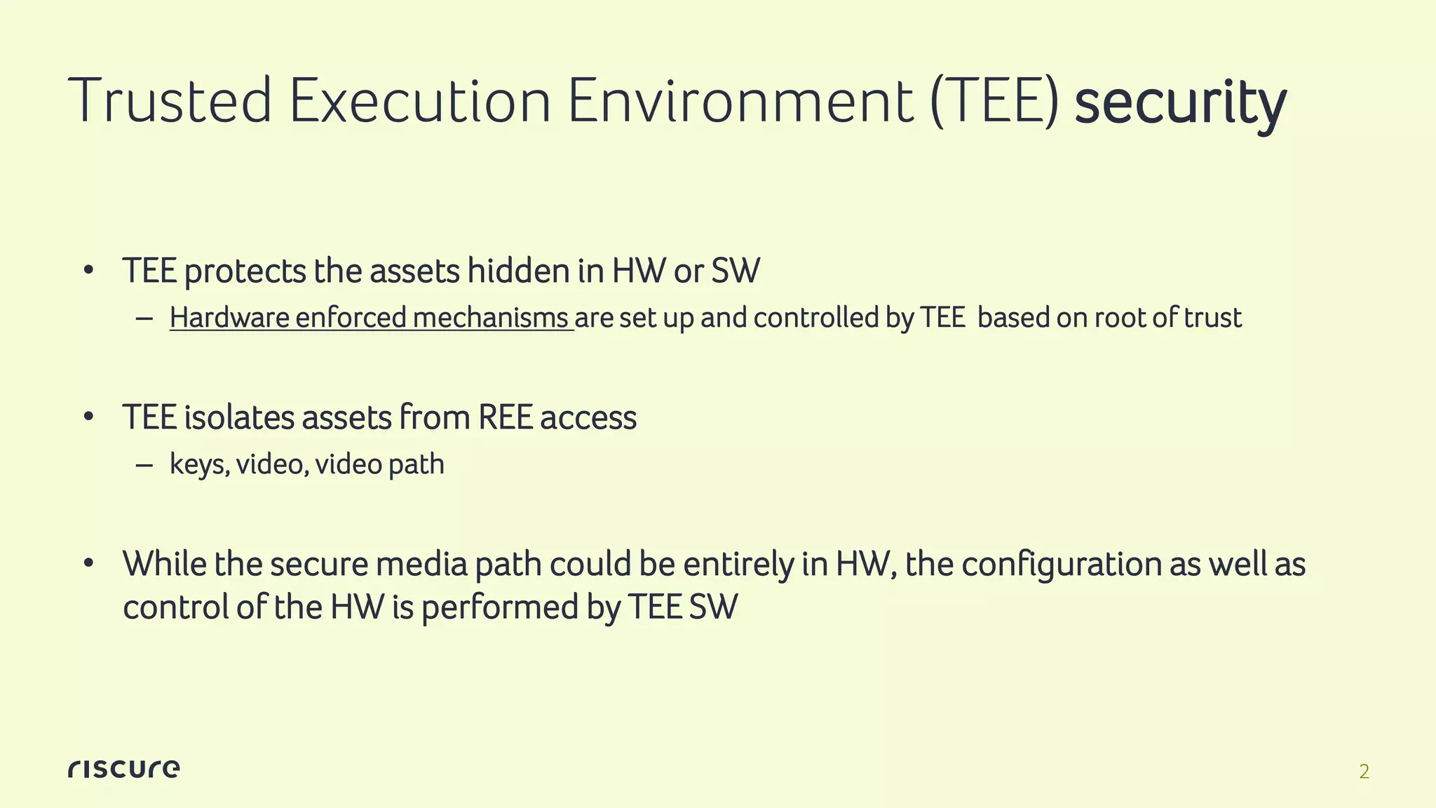 The document discusses Riscure assurance for premium content, focusing on Trusted Execution Environment (TEE) security and its mechanisms for protecting assets. It outlines challenges, issues with existing standards like Global Platform and Common Criteria, and proposes a methodology for component evaluations to enhance security assurance. The document also mentions compliance with MovieLabs specifications for enhanced content protection and the benefits of Riscure assurance screening.