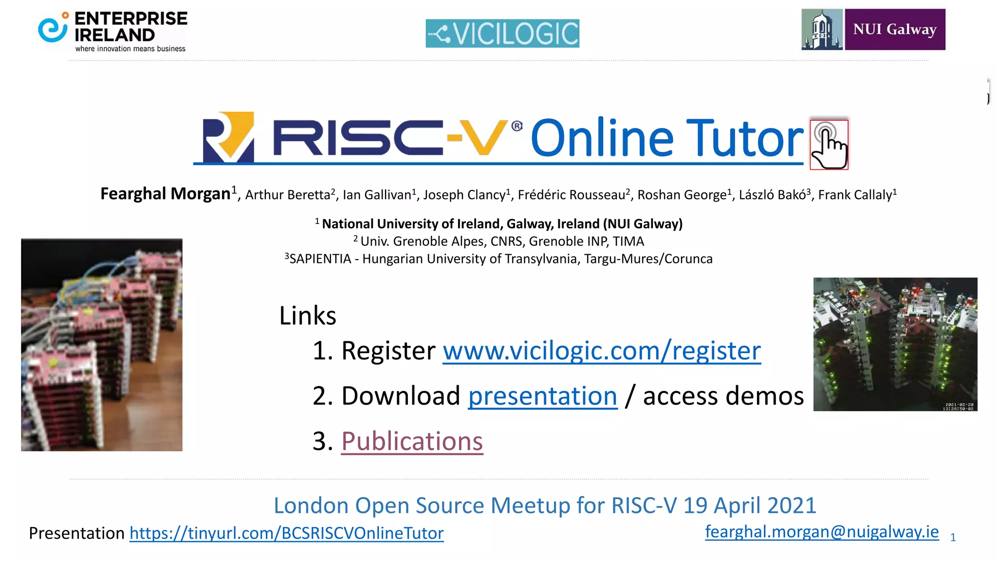 This document summarizes a presentation given at the London Open Source Meetup for RISC-V on April 19, 2021. The presentation introduced the RISC-V Online Tutor, an online course for learning RISC-V fundamentals from digital logic to C programming. It provided an overview of the course structure and lessons, which take students through RISC-V assembly, processor design, and application development. It also demonstrated the online learning platform and its ability to interact with remote FPGA hardware during lessons. The goal is to invite community participation and collaboration to further develop the Online Tutor.