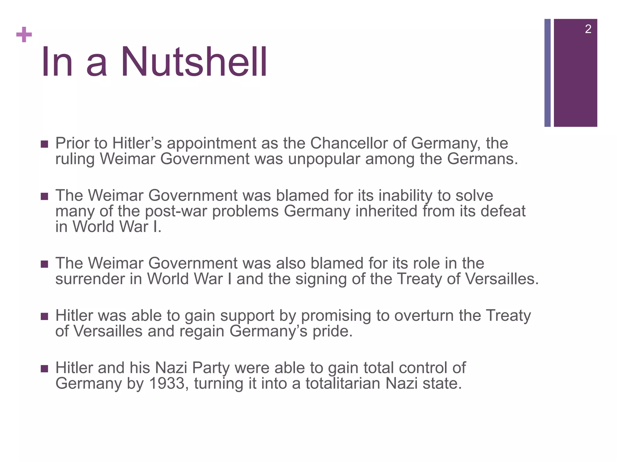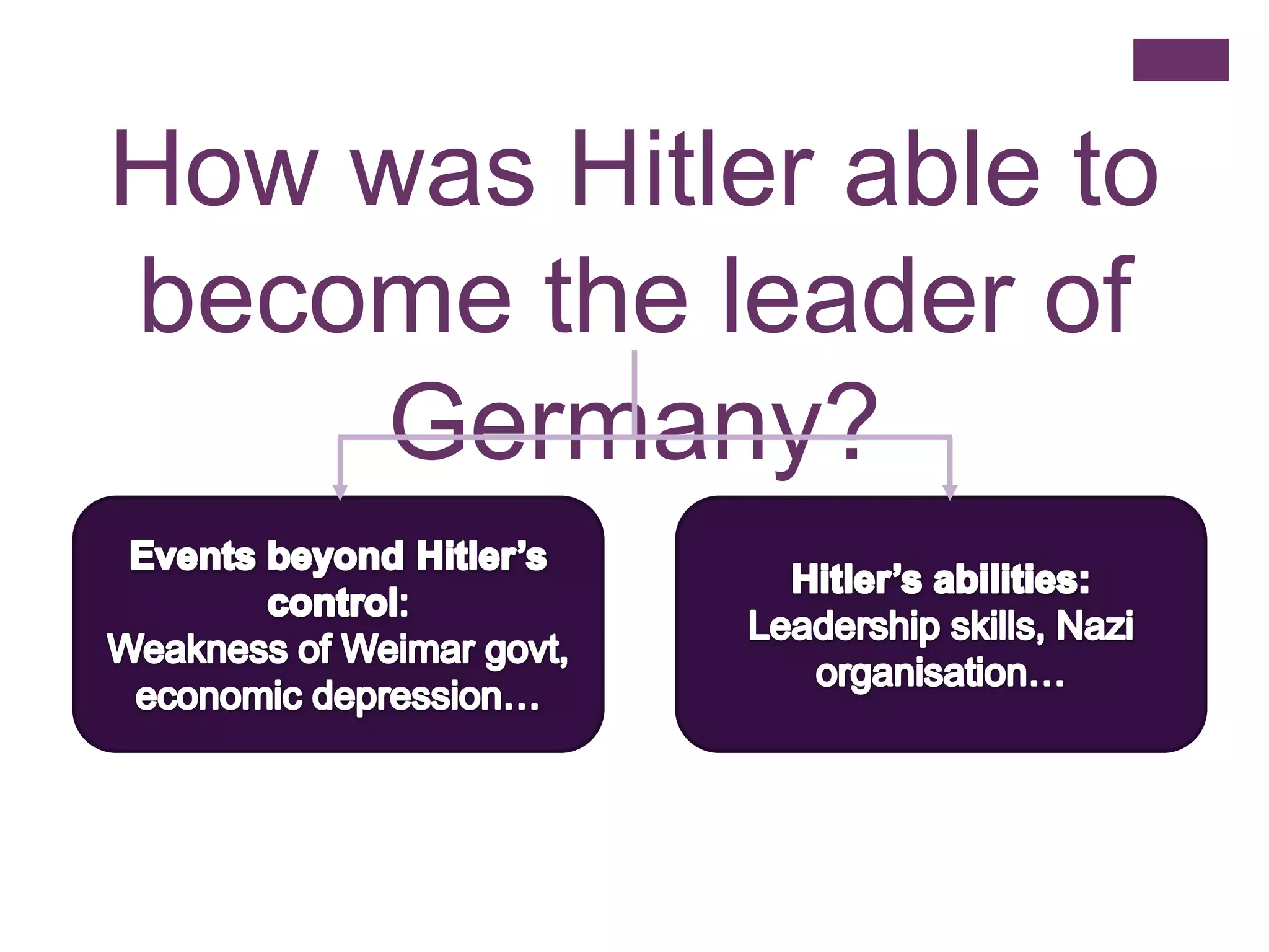 Hitler was able to become the leader of Germany due to several factors: (1) the unpopularity of the Weimar government which was blamed for Germany's defeat in WWI and economic struggles, (2) Hitler's charismatic speaking skills and promises to restore Germany's power and pride, (3) the Nazi party's improved organization under Hitler which helped them gain more support, especially after the Great Depression.