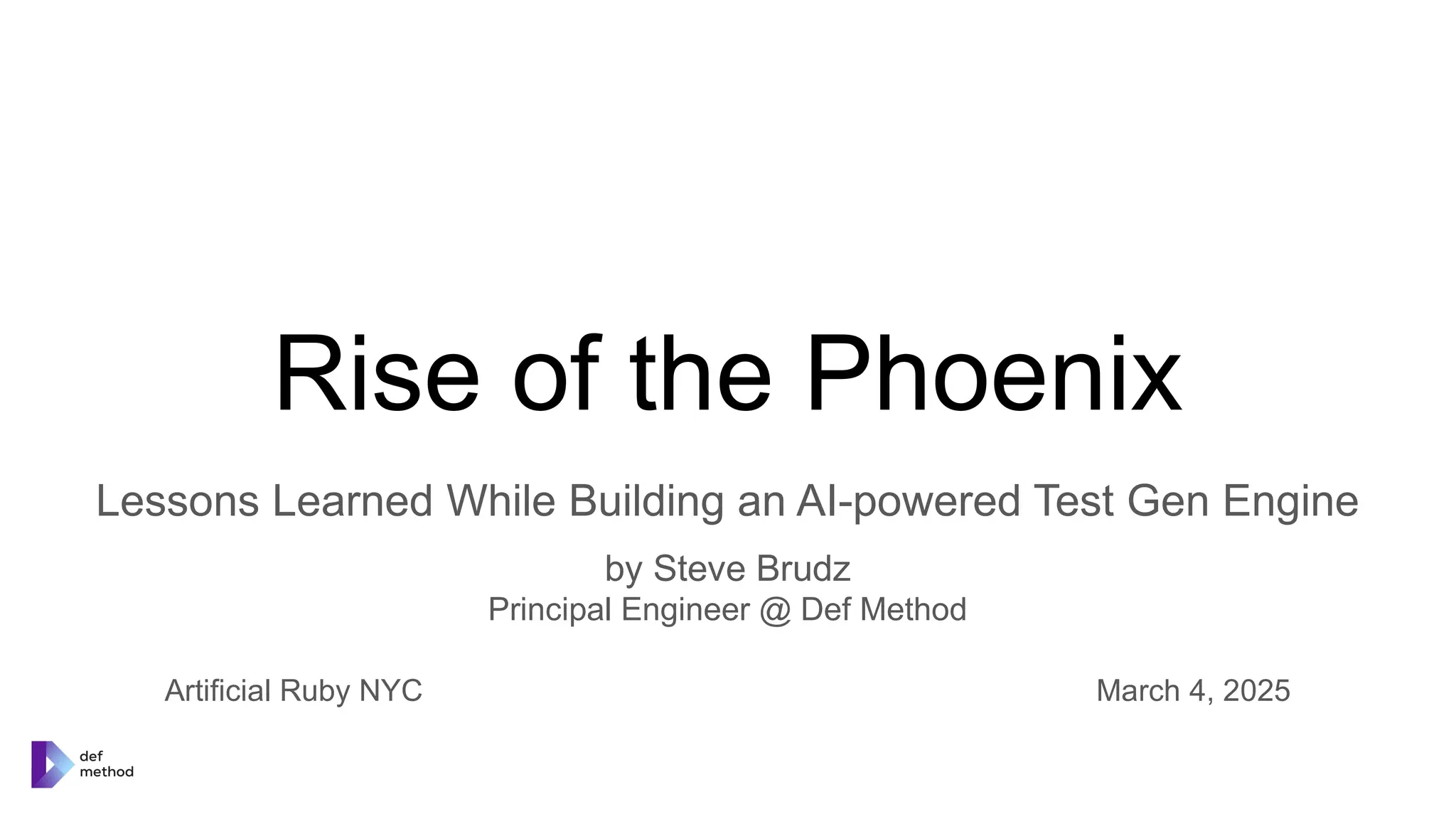 In this talk, I give an overview and demo of Phoenix, an AI-powered test generation engine for Ruby on Rails applications, and share lessons learned while building it. I presented this at the Artificial Ruby Meet Up in NYC on March 4, 2025.