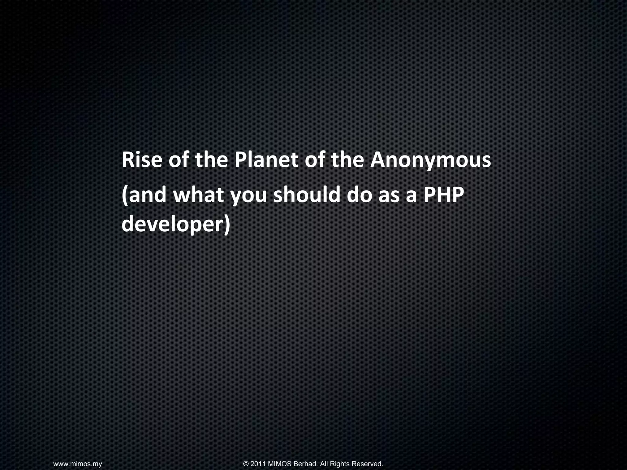 The presentation discusses the rise of the Anonymous group and its implications for PHP developers, emphasizing the importance of web security. It highlights that PHP is the most widely used server-side programming language and outlines potential security risks due to developer oversight. Resources for improving PHP security practices are also provided.