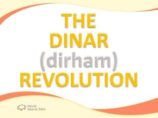 The document discusses the history and standards of the gold dinar and silver dirham currency. It argues that Muslims originally minted their own coins, with the dinar and dirham standards set by Umar ibn al-Khattab in the 7th century CE. Today, the World Islamic Mint aims to restore the dinar and dirham as a sharia-compliant currency backed by gold and silver. The document promotes the dinar and dirham as an alternative to fiat currencies and believes they will eventually be adopted on a global scale once fiat currencies fail.