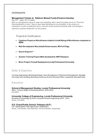 Rishabh Bhardwaj has over 8 years of experience in marketing, sales, and career counseling. He is currently a Senior Area Coordinator at Aakash Educational Services, where he provides counseling to students and coordinates career counseling sessions and marketing activities. Previously, he held roles in business development at Animate Studioz and customer acquisition at Abacasys. He has a MBA in Finance and Marketing from Lovely Professional University and a Bachelor's in Computer Science Engineering. His skills include training, marketing strategy, team management, and Microsoft Office.