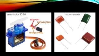 This document summarizes a student presentation on a simple robotic arm project using Arduino. The robotic arm is constructed out of cardboard and uses 4 servo motors that are controlled by potentiometers attached to an Arduino Uno board. Servo motors allow for accurate movement and positioning. The arm consists of 4 links connected by servos. Rotating the potentiometers provides variable voltage that maps to servo positions, allowing the user to control the arm. The code reads the potentiometer values and writes angles to each servo to manipulate the arm. The simple low-cost design makes it suitable for beginners to learn about robotics and Arduino.