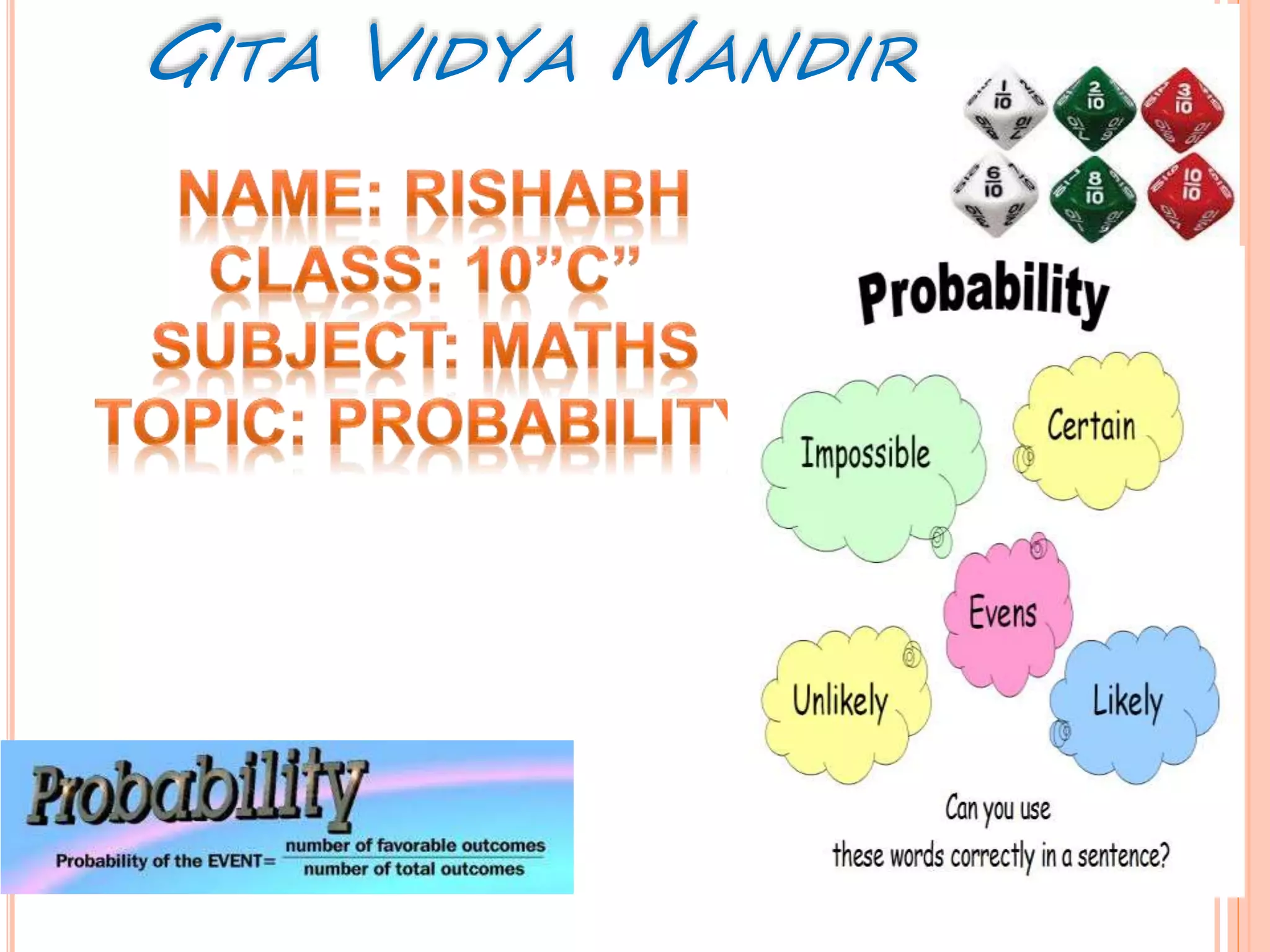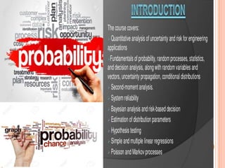 The document provides an introduction to probability. It defines probability as a measure of how likely an event is. Probability is expressed as the ratio of favorable outcomes to total possible outcomes. The concept of probability originated in the 16th century and has been developed by many mathematicians. Today, probability theory has applications in fields like science, economics, and engineering. The document also defines key probability terms like events, outcomes, sample space, and theoretical probability. It provides examples of calculating probability for experiments like tossing coins, rolling dice, and drawing cards.