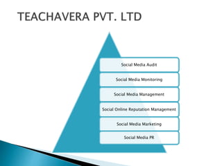 The document outlines Techavera Pvt. Ltd's comprehensive social media services, including auditing, monitoring, management, online reputation management, and campaign strategies across various platforms like Facebook, LinkedIn, Twitter, and Google+. It details a structured 12-month social media marketing plan aimed at increasing brand presence, customer engagement, and ROI through specific targets and costs associated with follower growth. Strategies encompass profile creation, content development, influencer engagement, and integrating various channels for effective outreach.
