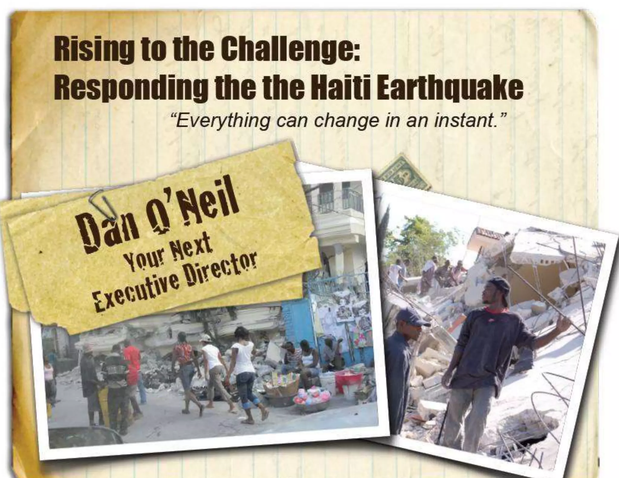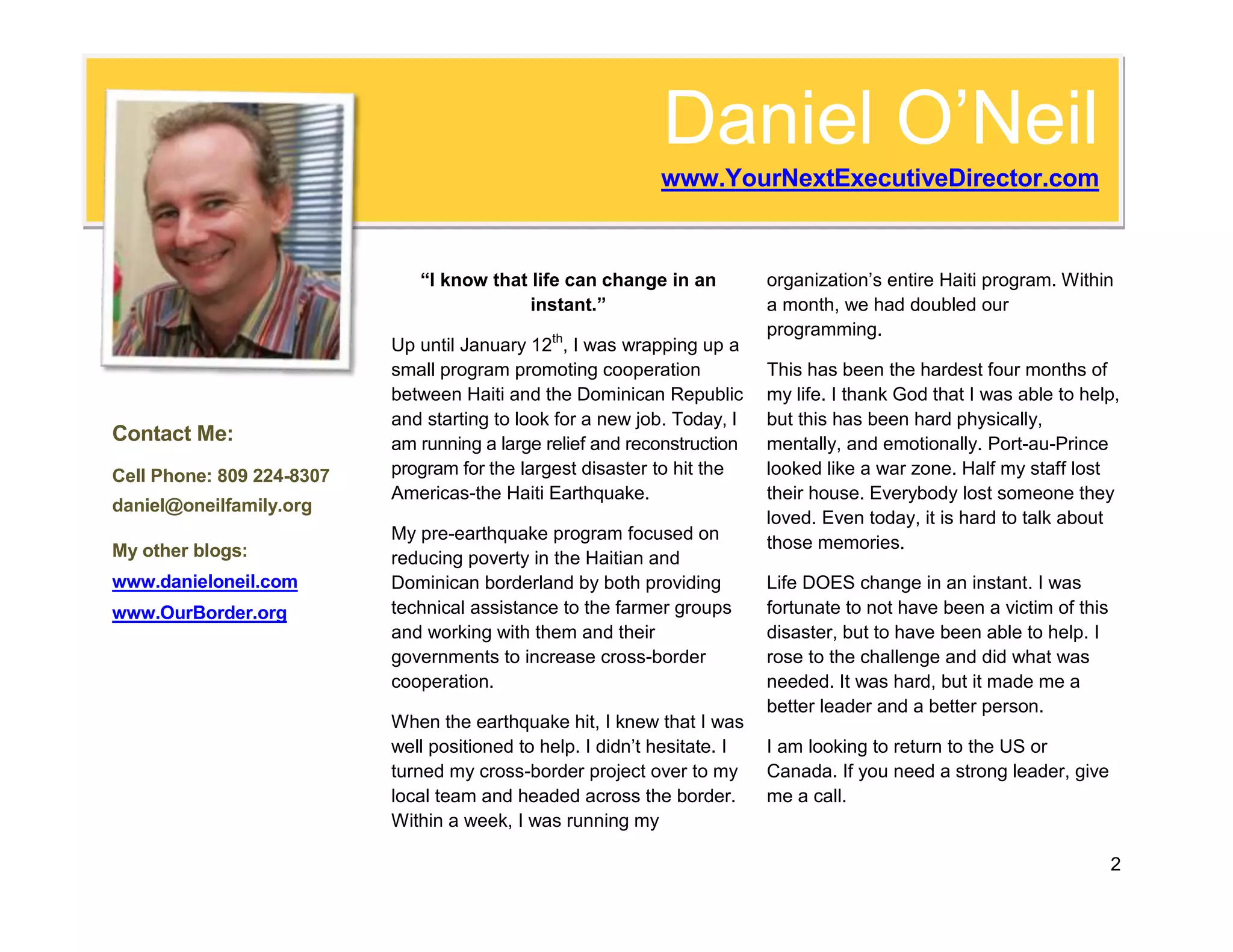 The document summarizes the author's experience leading relief efforts in Haiti after the 2010 earthquake. It describes how he took over leadership of his organization's Haiti program and doubled its scale within a month of the disaster. It discusses the challenges of managing relief operations amidst the destruction in Port-au-Prince. The author is now looking for a new leadership position, emphasizing his skills in strategy, managing people and operations, and resource development gained through his experience responding to the earthquake.