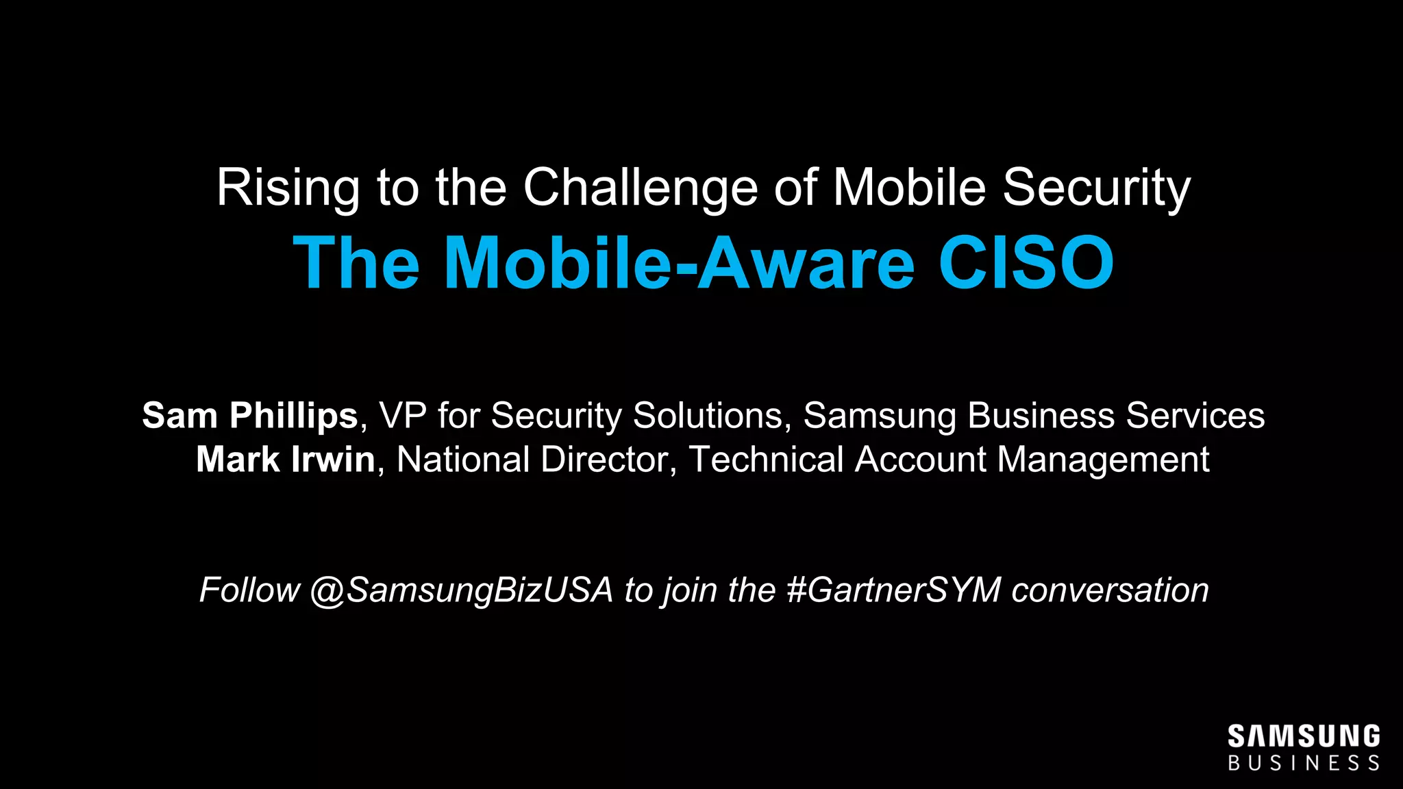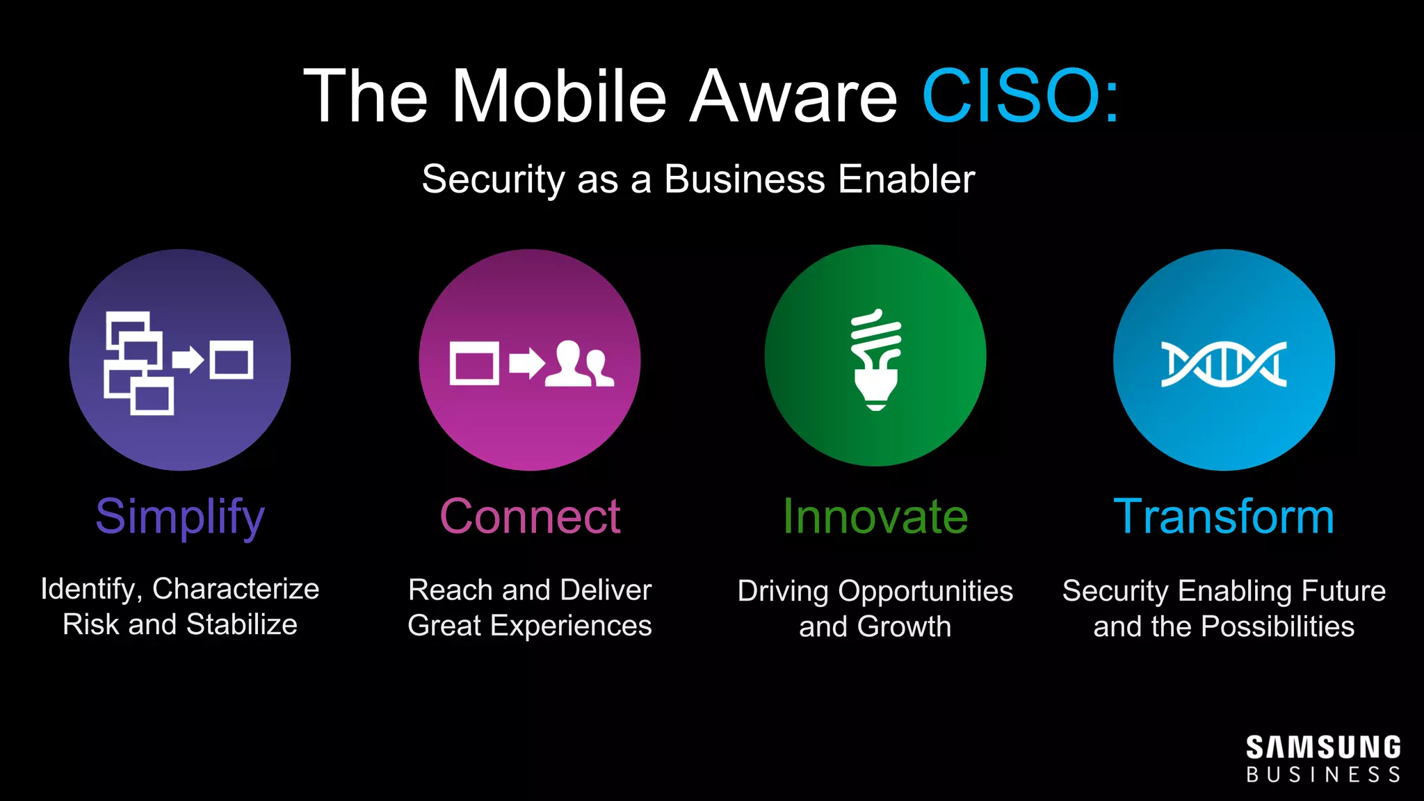 The document discusses how CISOs need to take a mobile-aware approach by understanding business drivers for mobility, establishing ownership over mobile security, understanding threats to what needs protection while balancing user experience, and helping drive business innovation through mobility. It also promotes Samsung Business Services which provide security, application support, and technical services to support CIOs and CISOs in securing mobile applications and devices.