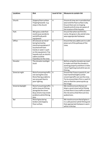 This document assesses potential risks and safety measures for filming at different locations. It evaluates risks such as slippery floors, tripping hazards, electrical equipment, traffic, and broken glass. Risk levels are assigned from 2 to 6. Locations include a church, park, office, elevator, street at night and day, and a bar. The document recommends measures like ensuring dry floor surfaces, appropriate footwear, safe cable placement, functioning elevators, lighting for traffic visibility, and safe glass positioning.