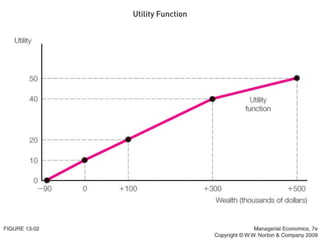 The document discusses risk analysis and decision-making tools for managers, focusing on concepts such as expected value, probability distributions, and techniques to reduce uncertainty. It covers the definition and measurement of risk, including standard deviation and coefficient of variation, as well as the expected value of perfect information (EVPI). The text also explores attitudes toward risk using utility functions and the certainty equivalent approach to assess investment decisions.