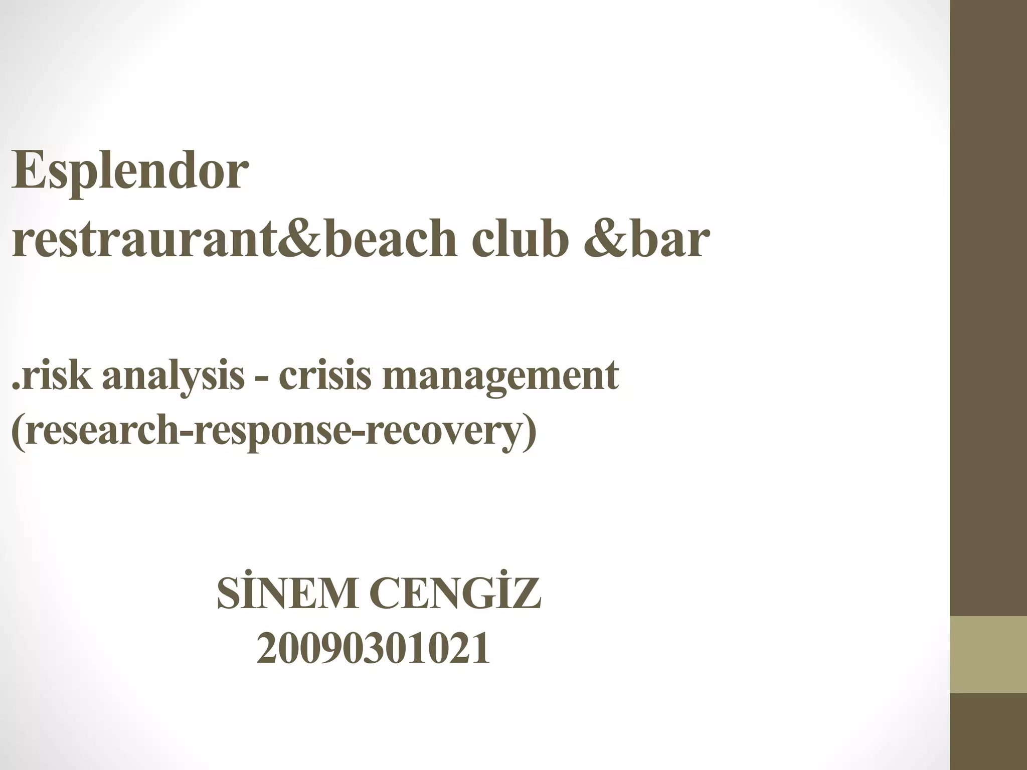 This document summarizes information about the Esplendor restaurant and beach club in Cesme, Izmir, Turkey. It provides details about the ownership, seasonal operations from May to September, menu offerings, and risks including natural disasters, technological issues, financial problems, and security/safety concerns for customers. It then discusses forming a crisis team and responses to a crisis like an armed assault, emphasizing effective communication, accepting responsibility, and maintaining reputation through the media.