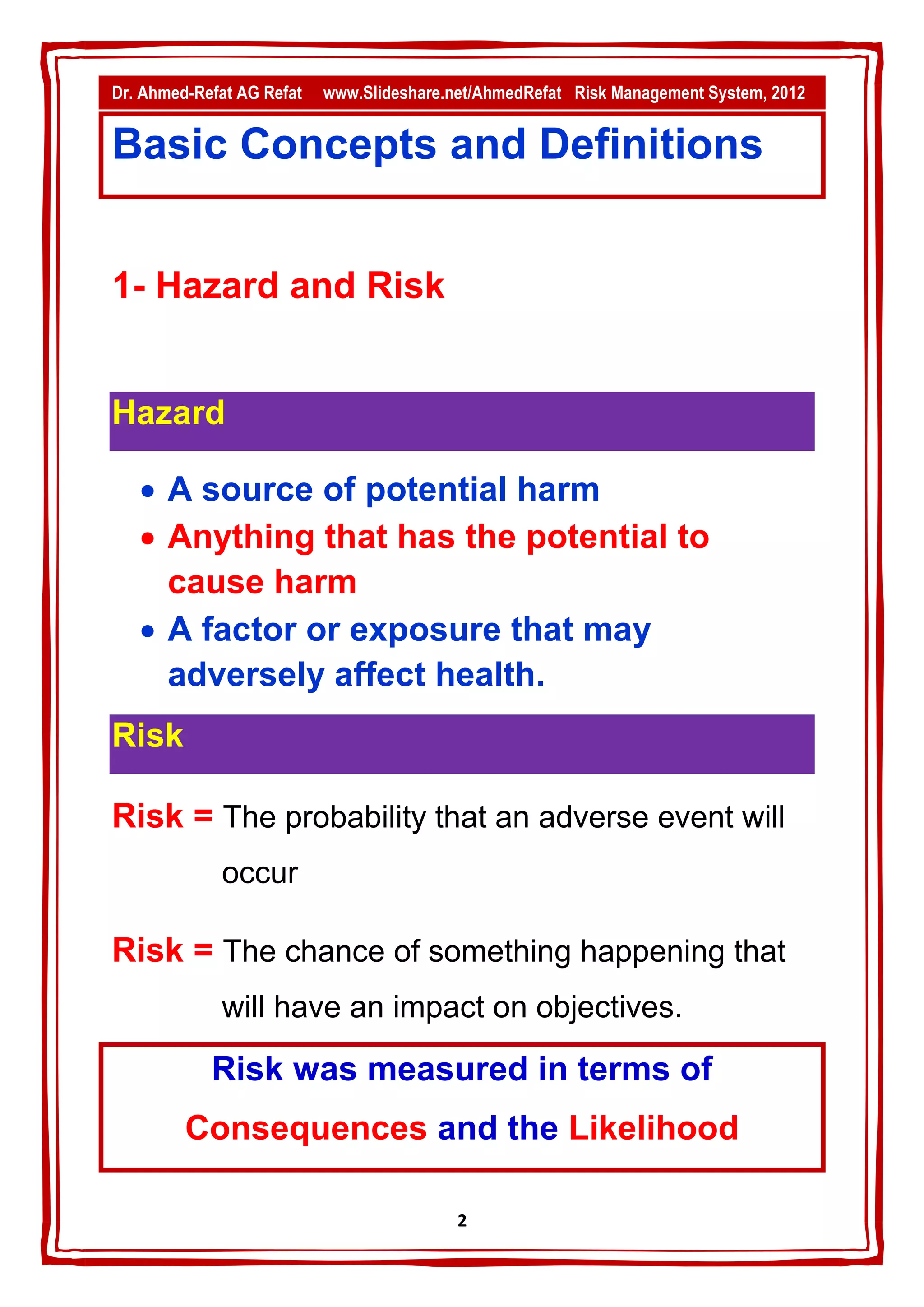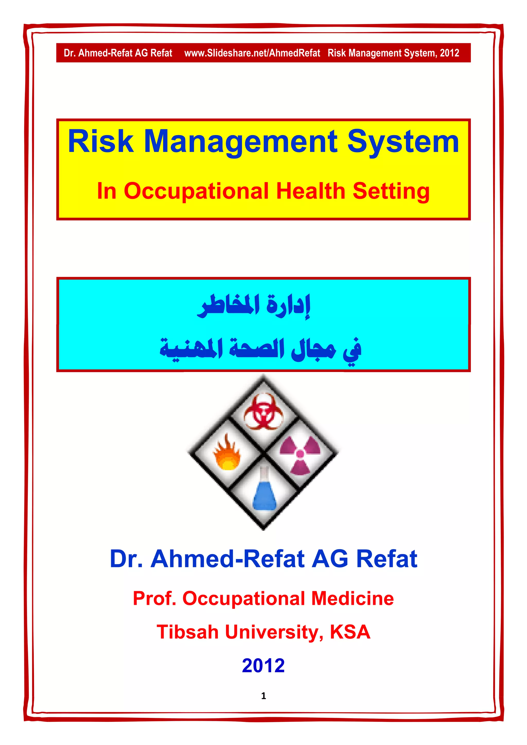 This document discusses risk management in occupational health settings. It defines key terms like hazard, risk, and risk management system. It describes the steps of a risk management process as establishing context, identifying hazards, analyzing risks, evaluating risks, treating risks, and reviewing risks. Various methods are presented for risk analysis, evaluation, and treatment, including risk matrices, risk score calculators, and risk nomograms. Control measures like elimination, substitution, engineering controls, administration controls, and personal protective equipment are also discussed.