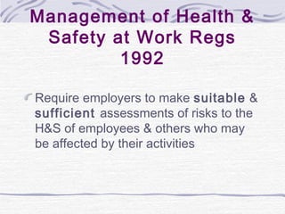 The document summarizes several key UK workplace health and safety laws and regulations including the Health and Safety at Work etc. Act 1974, Management of Health and Safety at Work Regulations 1992, Manual Handling Operations Regulations 1992, Health and Safety (Display Screen Equipment) Regulations 1992, Control of Substances Hazardous to Health Regulations 1994, Noise at Work Regulations 1989, and Personal Protective Equipment at Work Regulations 1992. It also notes that these laws are enforced by local authority Environmental Health Officers and Health and Safety Executive inspectors.
