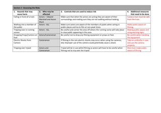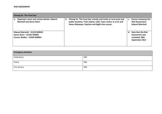 This risk assessment summarizes the risks involved in filming the movie "The Final Day" at various outdoor public locations. It identifies hazards such as falling in front of a train, tripping during running scenes, dropping equipment, electric shocks from cameras in the rain, and tripping over tripods. Controls to reduce risks include being aware of surroundings near trains, cordoning off running scenes, handling equipment carefully, using cameras properly in rain, and being careful of tripods. Additional measures include ensuring the camera operator's safety near trains, notifying the public of filming, and using warning signs.