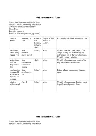 This risk assessment checklist identifies potential hazards for filming a music video in various locations and outlines preventative measures. Hazards include tripping over cables, falling off stages, hitting lights, injuries in crowds, strangers at train stations and on city streets, traffic, weather, and hot hair tools. Risks are assessed as unlikely but possibly major or minor. Preventative methods include making all crew and cast aware of hazards, taping down cables, treating injuries, filming with caution near hazards, and keeping a first aid kit available.