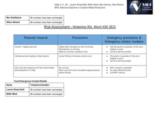 This document contains risk assessments and emergency contact details for a film production team shooting at various locations. It identifies potential hazards such as tripping, falling, drinks spilling on devices. Precautions include clearing paths, not running, and keeping drinks away from devices. Emergency procedures involve calling emergency services or parents for serious injuries and using first aid kits. It also provides the team members' names and exchanged contact numbers.