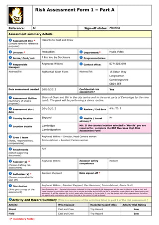 This risk assessment summarizes the activities of filming a music video in Cambridge, England. It identifies three main activities: filming in the city center streets, filming in rural fields, and filming from the top level of a multi-story car park. Hazards include tripping, slipping, falling into the river, being hit by cars, and falling over edges. Controls include sticking to paths, checking weather and ground conditions, staying away from hazards, and having crew monitor safety. With controls in place, all activities are deemed to have a low risk level.