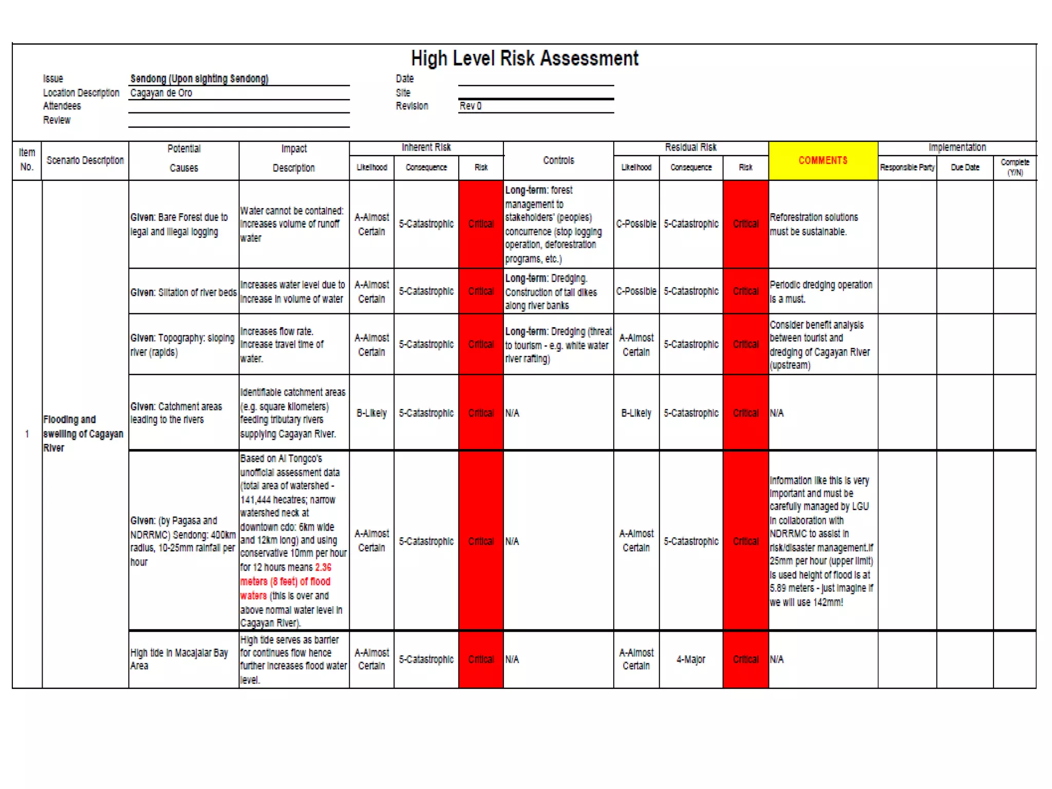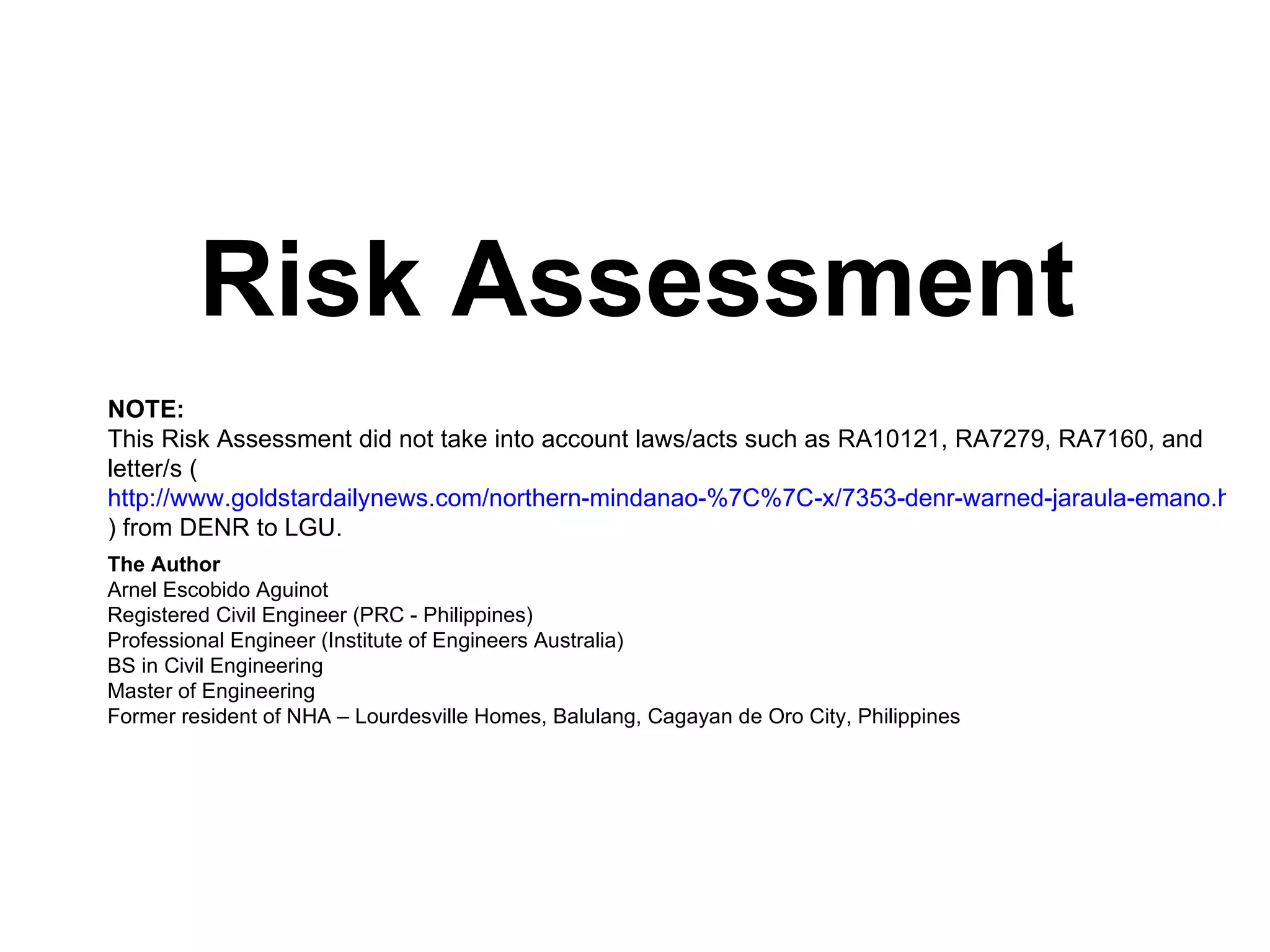 1) This risk assessment examines the risks of flooding in Cagayan de Oro City from Cagayan River prior to Typhoon Sendong making landfall.