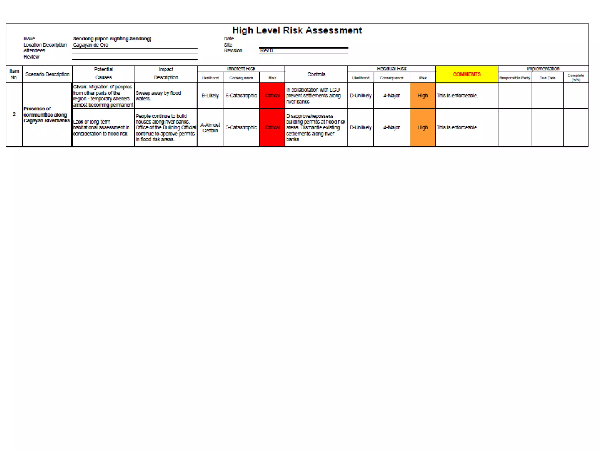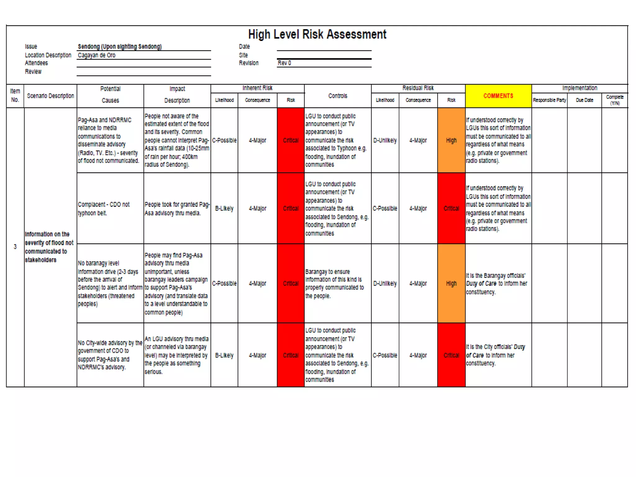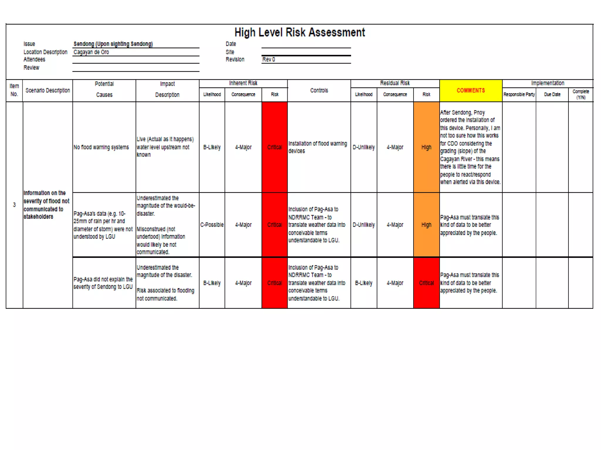 3) As the assessment was done with limited data pre-Sendong, it should be considered an approximation, but can still be used to simulate the pre-landfall risk scenario to help disaster management planning going forward. Regular reviews are recommended.