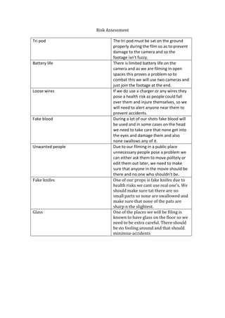 The risk assessment document outlines several risks that need to be addressed during the film shoot. These include properly securing the tripod to prevent camera damage, using multiple cameras to address limited battery life, alerting people to loose wires to prevent falls and injuries, taking care that fake blood does not get into eyes or swallowed, politely asking unnecessary people to move or editing them out, ensuring fake knives have no small parts or sharp edges, and being extra careful in an area known to have glass on the floor.