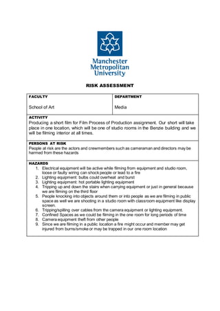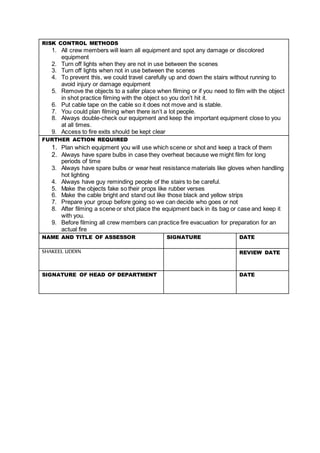 This document summarizes the risk assessment for a student film shoot taking place on the third floor of the Benzie building. It identifies potential hazards such as electrical equipment, hot lighting, tripping hazards on the stairs, obstacles in the studio space, cables on the floor, confined spaces, and the risk of fire. Control methods are outlined like inspecting equipment, taping cables, clearing exits, and practicing fire evacuation. The assessment recommends further preparation like tracking equipment use, having spare bulbs, marking cables, and securing valuables between takes.