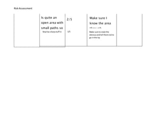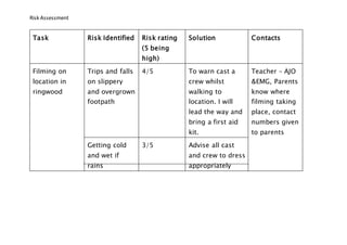 This risk assessment document identifies risks for a film shoot location in a forested area, rates each risk from 1 to 5, and proposes solutions. It notes risks of trips and falls from slippery paths rated a 4, getting cold and wet from rain rated a 3, and getting lost among small forest paths rated a 2. A risk of injury from sharp objects in a nearby skip is rated a 1. Solutions include the document author leading with first aid, advising proper clothing, familiarizing with maps, and warning about the skip area. Teachers and parents are contacts in case of any incidents during filming.