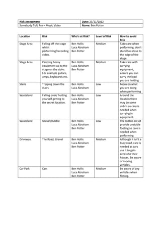 The risk assessment document identifies potential risks for filming the music video "Somebody Told Me" in six different locations. These include falling off the stage, carrying heavy equipment, tripping on stairs, falling or getting hurt at the secret wasteland location due to debris, unstable rubble footing, and interacting with vehicles on the driveway and car park. Mitigation strategies are provided such as taking care when performing or carrying equipment and being aware of moving vehicles.