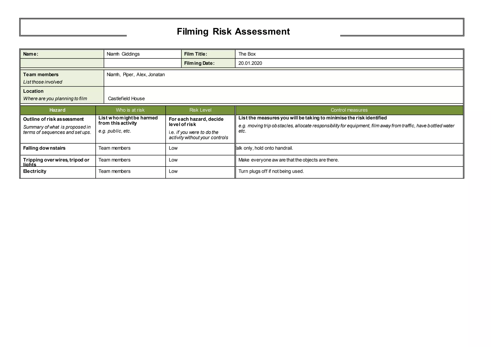 Niamh Giddings will film "The Box" on January 20, 2020 at Castlefield House with a team of four people. They plan to film sequences and setups that could involve falling downstairs, tripping over equipment, or electrical hazards. To control these risks, the team will walk carefully, hold handrails, make others aware of objects on the floor, and turn off unused electrical plugs.