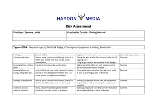 This risk assessment document outlines several risks associated with an internal film production and ways to minimize those risks. The risks include tripping over wires, electrical fires from improperly used lighting equipment, damage to expensive cameras and equipment, and medical issues from preexisting conditions. The document assigns responsibility for mitigating each risk to the producer, Gemma Lovitt, and suggests taping wires, properly using and turning off lights, regularly checking equipment, and ensuring medical preparedness.