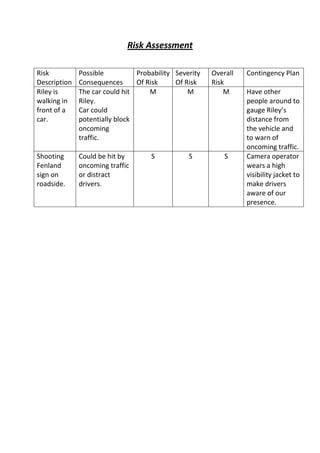 Riley faces a medium risk of being hit by a car while walking in front of it for a shoot, with the car possibly blocking traffic if it had to stop suddenly. Shooting a sign on the roadside poses a lower but still significant risk of distracting drivers or the crew being hit by traffic, though wearing high-visibility clothing can help warn drivers. Contingency plans include having others monitor Riley's safety and using safety gear to be visible to traffic for the roadside shoot.