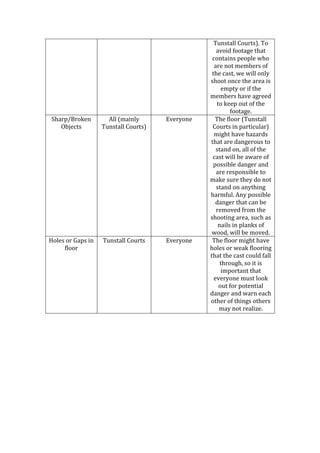 The document identifies risks and responsibilities for an acting production. It notes risks such as injury from shooting scenes, actor inconvenience, equipment problems, trip hazards, broken equipment, issues with props/costumes, poor actor performance, public interference, sharp/broken objects, and holes in the floor. It assigns responsibilities for overcoming these risks to all members of the production and proposes solutions like using back-up actors, checking equipment, being aware of hazards, arranging costumes, improving performances, emptying areas of public, and removing/avoiding dangerous objects.