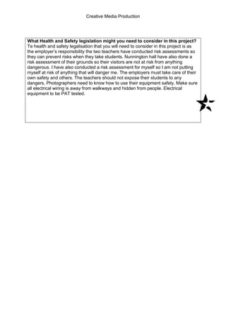 The risk assessment identifies several potential hazards for a photography shoot at Nunnington Hall, an old house. Hazards include objects falling and hitting people due to the unstable nature of the old building. Tripping is also a risk if people are not watching where they walk. The model is at risk of getting cold from limited clothing and exposure during shoots. Electrical equipment could cause electric shocks if mishandled. In the parking lot, cars backing out present collision risks. Control measures include being aware of hazardous areas, watching foot placement, keeping the model warm between shots, safe handling of electrical gear, and care in the parking lot.