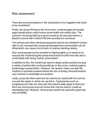 The document outlines some health and safety risks that need to be considered for a magazine photo shoot. Camera equipment needs to be securely mounted to tripods to prevent falling and hurting anyone. Electrical equipment also needs protection from rain to avoid damage or sparks that could harm people. Models should not have light sensitivities and must feel comfortable in the positions used to avoid risk of injury. Props like knives also require careful usage to maintain safety.