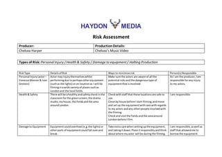 Chelsea Harper is producing a music video for Chelsea's song. There are several risks to consider including personal injury to the actors, health and safety issues across various filming locations, and potential damage to equipment. To minimize risks, the producer will ensure actors are aware of dangers, conduct health and safety checks of all locations, carefully set up and handle equipment, and take responsibility along with staff for any issues that arise.