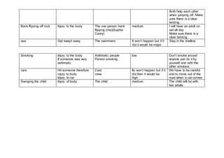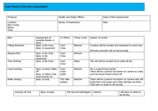 This risk assessment document identifies potential risks from various activities involved in a film production shooting in a beach town and new forest location. It lists the hazards, those affected, and the threat level for each risk, along with control measures to mitigate the risks. Potential risks addressed include falling branches, slippery floors, tree climbing, long boarding, roller skating, jumping off rocks, back flipping off rocks, sea hazards, smoking, cars, and swinging a child. Control measures range from having adults supervise activities to scouting locations in advance to reduce risks.