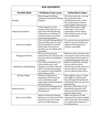 The document lists several possible risks that could occur during the filming of a movie sequence and actions that can be taken to address them. These risks include bad weather damaging equipment, filming in dangerous locations, props being unavailable, tripping over wires, unsuccessful marketing hurting profits, filming at night being dangerous, cameras breaking, and actors not being available. To mitigate these risks, the document recommends covering up equipment in bad weather, filming indoors or at night with less traffic, purchasing props early, being aware of wires, carefully marketing the film, filming earlier in the night, handling equipment with care, and ensuring reliable actors.