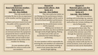This document summarizes 7 potential hazards for a student film project shooting scenes in rural and urban locations in Yorkshire, England. The hazards identified include animals/insects due to filming in woodland areas, alcohol/drugs from filming in a pub setting, extreme weather conditions, strobe lighting effects in a live performance scene, fire risks from materials used, risks associated with night filming, and risks from public crowds in locations like a Christmas market and pub. For each hazard, the document outlines who may be exposed, recommended actions to mitigate risks, and responsibilities for ensuring safety precautions are followed.
