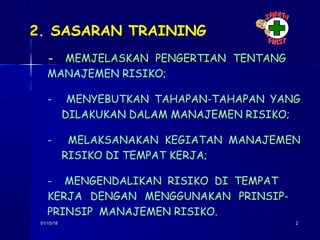 Dokumen ini membahas manajemen risiko di tempat kerja, termasuk pengertian, tahapan, dan pentingnya pengendalian risiko. Ditekankan bahwa manajemen risiko sebaiknya dilakukan oleh tim dan dapat diterapkan pada berbagai tahap, mulai dari perencanaan hingga penemuan bahaya baru. Identifikasi dan analisis risiko adalah bagian penting dari proses yang meliputi penilaian peluang, akibat, dan paparan.