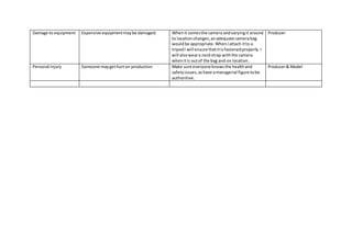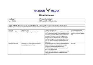 This risk assessment document outlines the key risks for Amy Shields' "Mess is Mine" music video production. It identifies health and safety concerns from hot lighting equipment, the risk of halting production if the model is unavailable, and potential damage to expensive cameras and equipment. Ways to minimize each risk are provided, such as using LED lights, extensive advance planning of shoots, and proper use of camera bags and straps. The producer and all crew are made responsible for understanding and following the safety protocols.