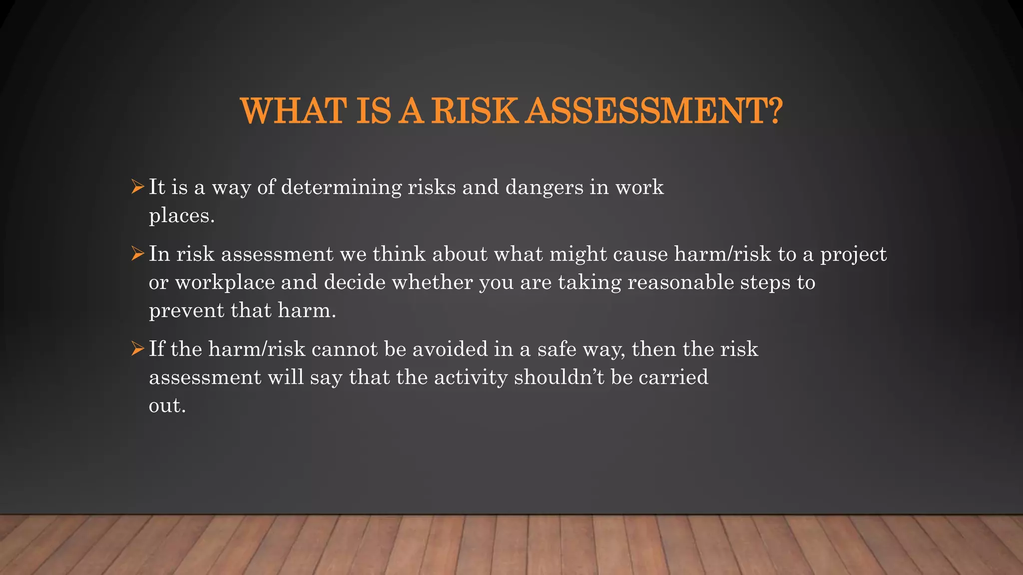The document discusses the process of conducting a risk assessment. It defines risk assessment as identifying potential harms or dangers in the workplace and determining their likelihood and impact. The document outlines a 5-step process for risk assessment: 1) identify hazards, 2) analyze risks, 3) evaluate risks, 4) control risks, and 5) monitor and review risks. It also discusses using a risk matrix to help prioritize risks based on their probability and potential impact. The risk matrix assigns quantitative values to probability and impact to calculate the overall risk rating.