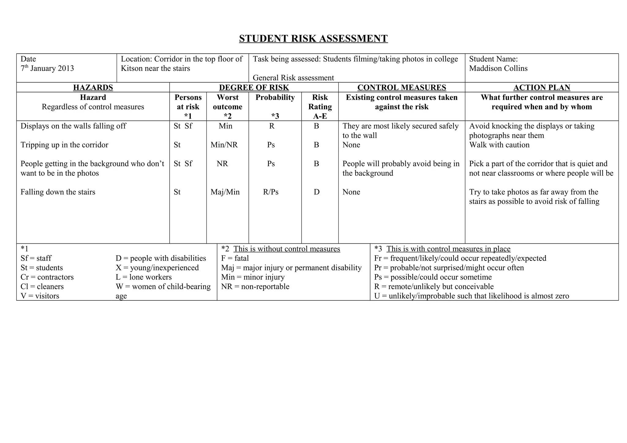 This risk assessment document summarizes potential risks for a student filming in the corridor of a college building. It identifies hazards such as displays falling from walls, tripping in the corridor, people getting in photos who don't want to be, and falling down nearby stairs. For each hazard, it rates the probability and worst potential outcome, both with and without existing control measures. The action plan recommends students avoid knocking displays, walk with caution, pick quiet areas away from classrooms to avoid backgrounds, and take photos far from the stairs.