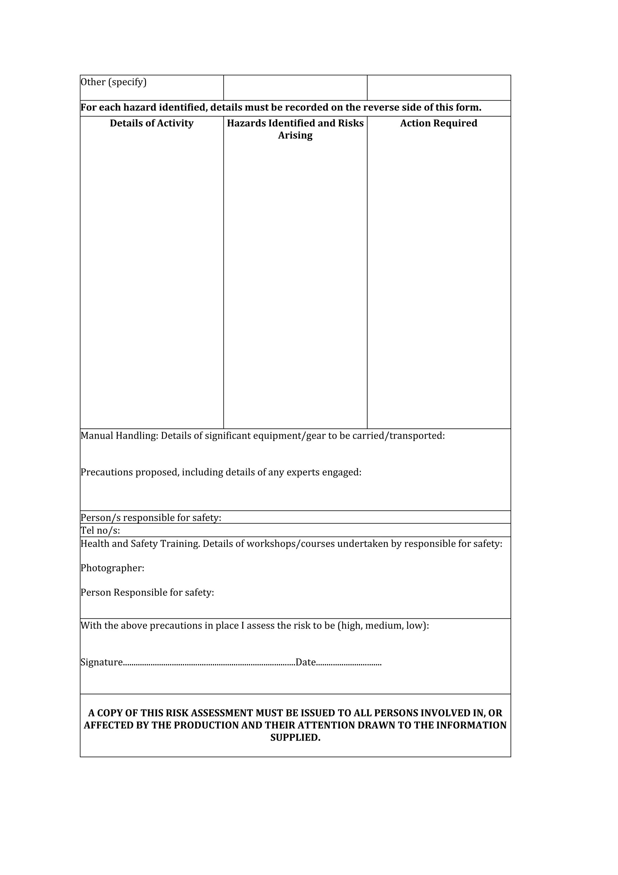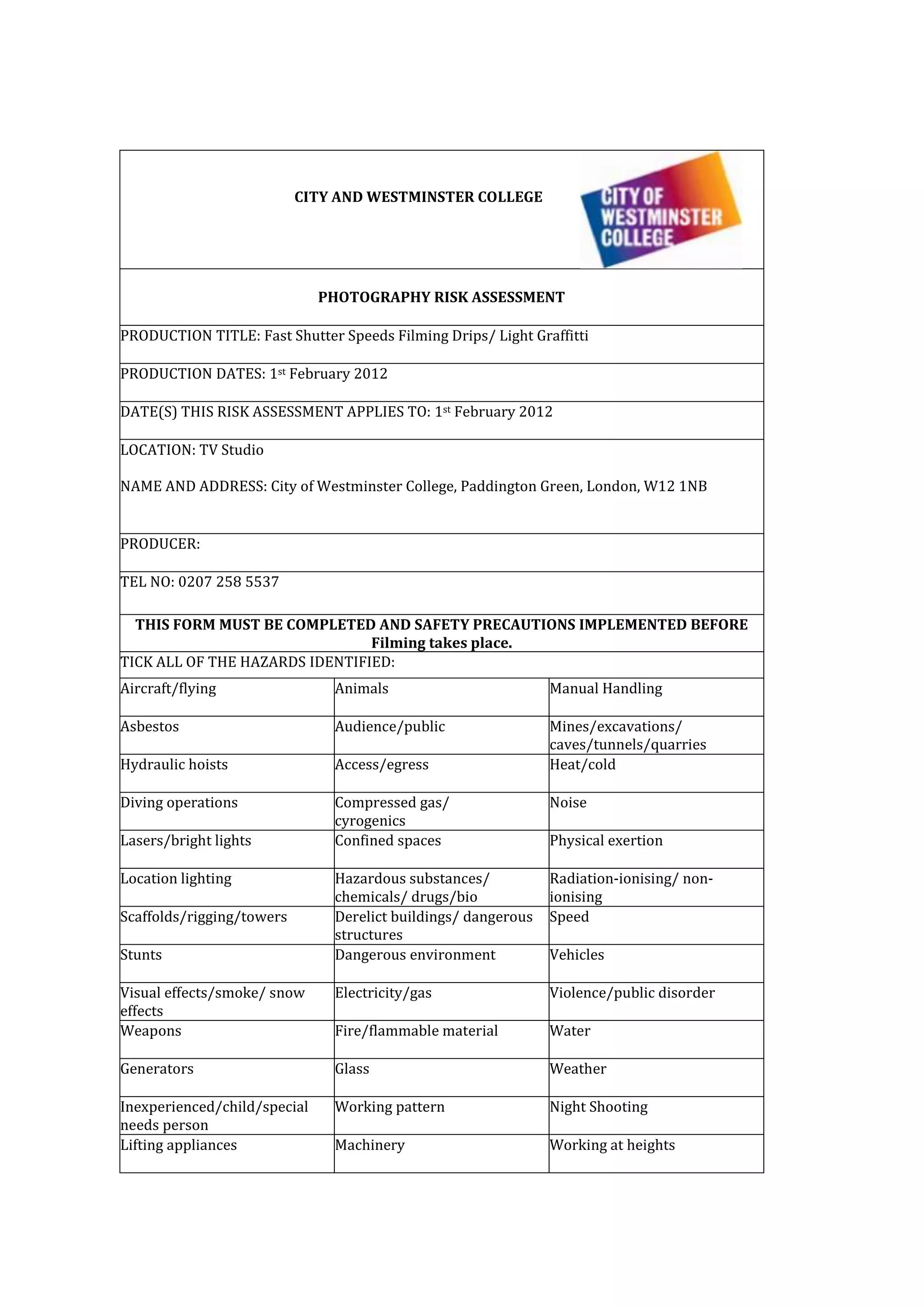 This risk assessment document is for a photography production filming fast shutter speeds of drips and light graffiti at the City of Westminster College TV studio on February 1st, 2012. Hazards identified include lasers/bright lights, electricity/gas, and working at heights. The risk assessment details the manual handling of equipment, proposed safety precautions including engaging experts, and identifies the photographer and person responsible for safety. With precautions in place, the risk is assessed to be low.