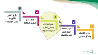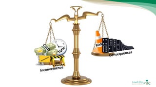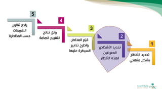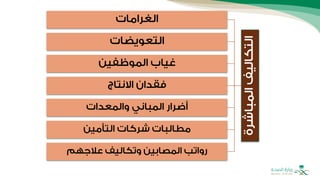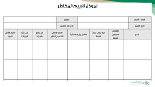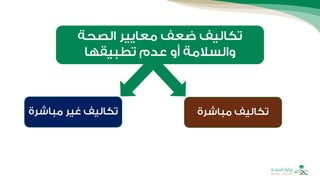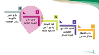 يتناول هذا المستند تقييم المخاطر في بيئة العمل، ويشدد على أهمية الصحة والسلامة المهنية لتفادي الحوادث وتحسين مستوى الرفاهية للموظفين. كما يوضح المستند كيفية التعرف على أنواع الحوادث الرئيسية وأسبابها، بالإضافة إلى ضرورة تطبيق اللوائح والإجراءات القانونية المترتبة على التقيد بمعايير السلامة. يشمل أيضًا تحليل التكلفة المرتبطة بالامتثال لسياسات الصحة والسلامة وآثار عدم الالتزام بها.