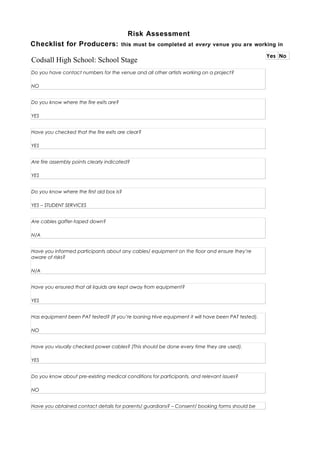 This risk assessment checklist identifies potential hazards for a media filming project at Codsall High School stage. It notes that while fire exits are clear and equipment has been visually checked, consent forms are incomplete and equipment has not been PAT tested. Preventative methods include taping cables, being aware of trip hazards, and securing lighting to reduce risks of falling or tripping. The assessment concludes by noting actions to check for injuries and seek assistance if an accident occurs.