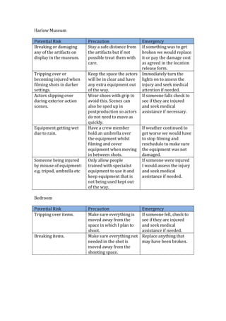 The document outlines potential risks, precautions, and emergencies for various photography and filming locations including a photography studio, Harlow Museum, bedroom, woods, and college buildings. Some key risks addressed are tripping over wires or equipment, models falling, falling from ladders, hot studio lights, damaging artifacts, slipping during outdoor scenes, equipment getting wet, injuries from equipment misuse, tripping over items indoors, falling branches outdoors, wild animals, and obstructions from other people or furniture. The recommended precautions generally involve keeping areas clear, using caution near hazards, and only allowing trained operation of equipment. In the event of injuries, the response is to assess severity and seek medical help if needed.
