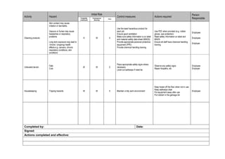 This document summarizes the risks and control measures for various tasks and equipment used at a café. It identifies hazards such as electrical equipment, use of coffee machines, slips and trips, noise, contact with customers, manual handling, cleaning products, uneven terrain, and general housekeeping. For each hazard, it rates the initial risk based on likelihood and severity of an incident occurring. It then lists control measures and actions required to minimize risks, and identifies the person responsible for implementing them. The overall goal is to eliminate hazards where possible, and implement engineering, administrative and personal protective equipment controls to reduce risks to acceptable levels.